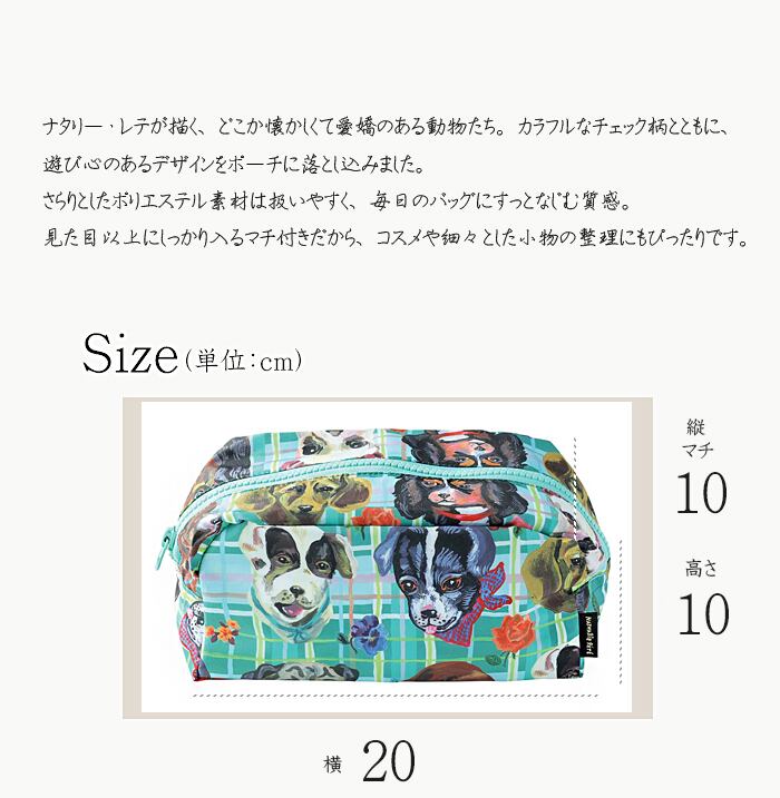 ナタリー・レテが描く、どこか懐かしくて愛嬌のある動物たち。カラフルなチェック柄とともに、遊び心のあるデザインをポーチに落とし込みました。 さらりとしたポリエステル素材は扱いやすく、毎日のバッグにすっとなじむ質感。 見た目以上にしっかり入るマチ付きだから、コスメや細々とした小物の整理にもぴったりです。